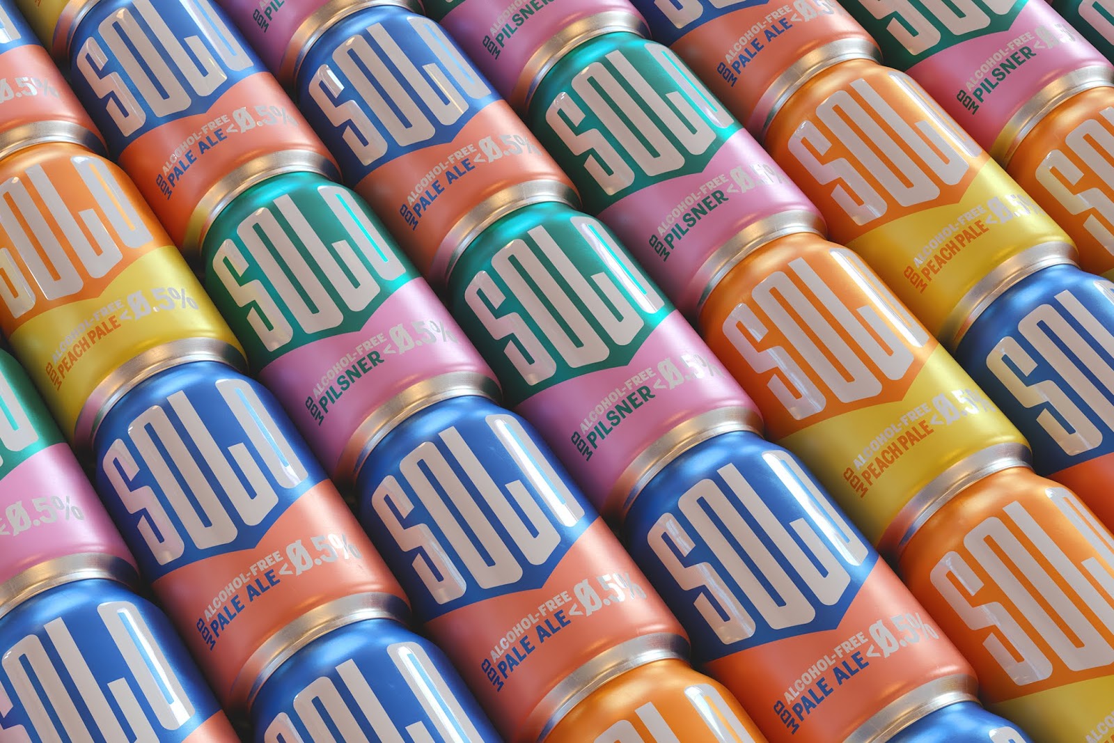 Solo無酒精啤酒包裝,三個關鍵詞運動感,下箭頭,對比色。抓住了人們心智厭惡混亂的特點,簡潔明了的描述了產品賣點無酒精淡啤,通過向下的箭頭不斷暗示消費者酒精度數已經下降到零,對比色區分信息,增強識別性。