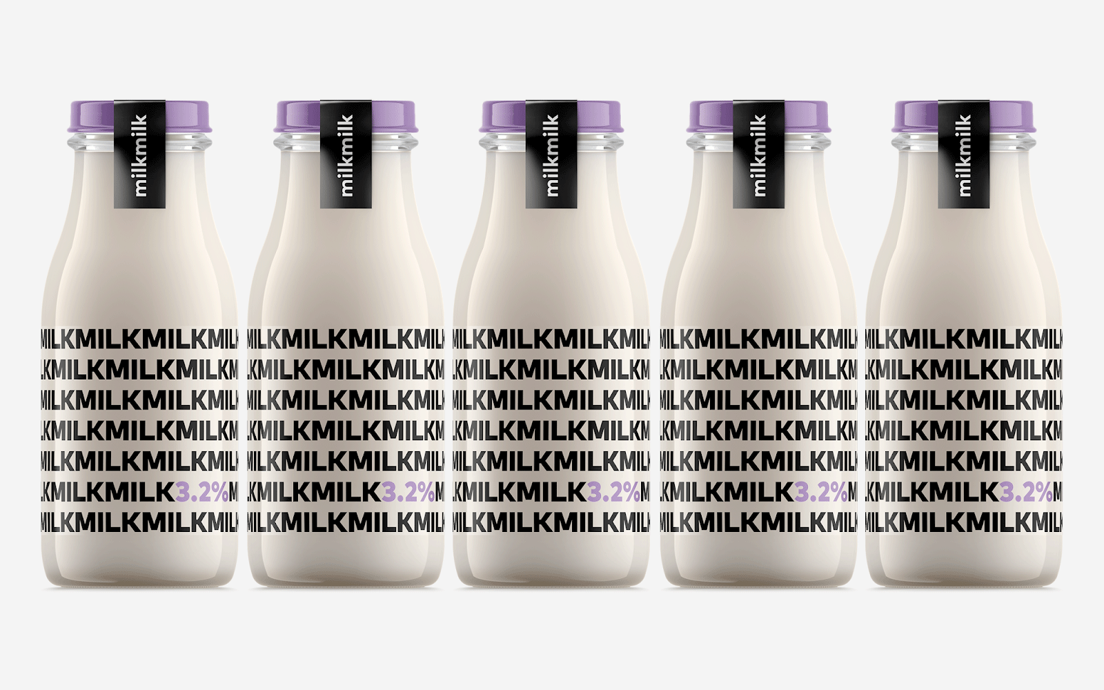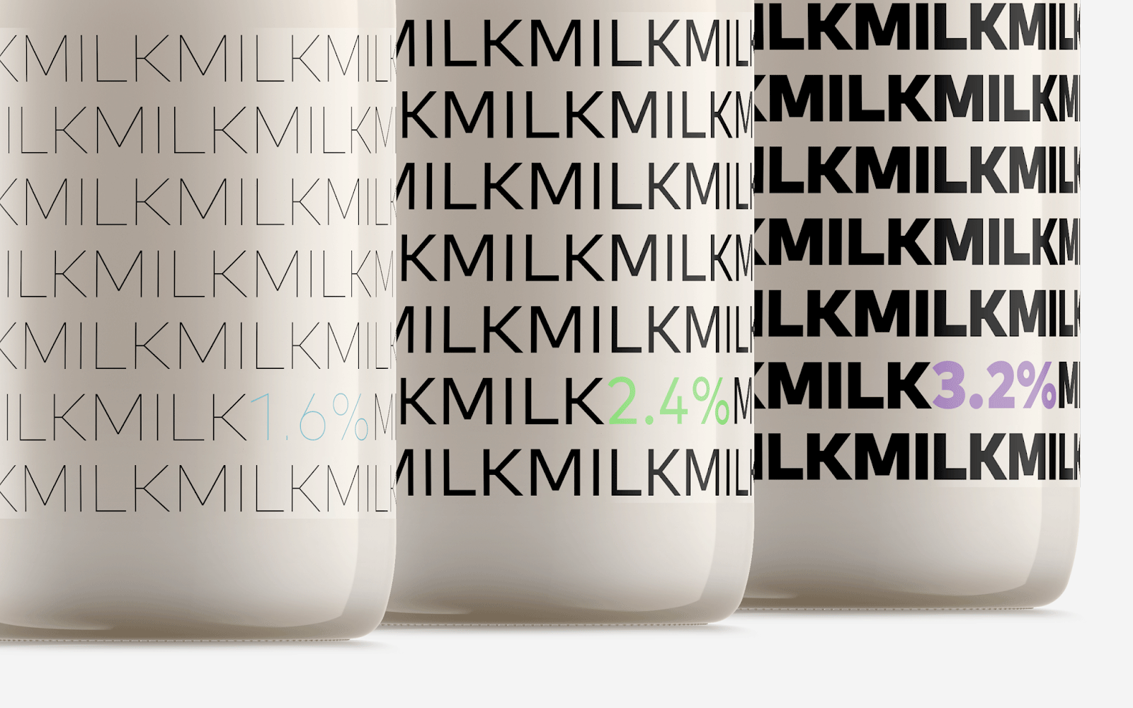 阿塞拜疆設(shè)計(jì)師Rahim Ismayil設(shè)計(jì)的牛奶包裝,設(shè)計(jì)師通過字體粗細(xì)來表現(xiàn)牛奶的脂肪含量。粗體字表示脂肪含量高,而細(xì)體字則表示脂肪含量低。通過瓶蓋顏色和極簡(jiǎn)外觀讓人有一種新鮮直觀的感覺。讓人在遠(yuǎn)處看到,想走近拿起來,進(jìn)一步了解情況的沖動(dòng)。