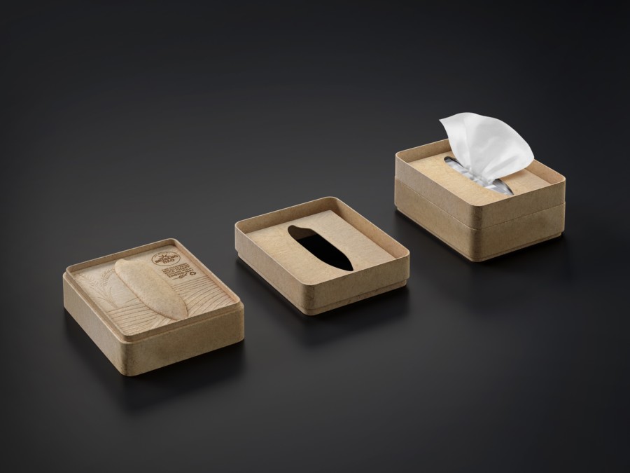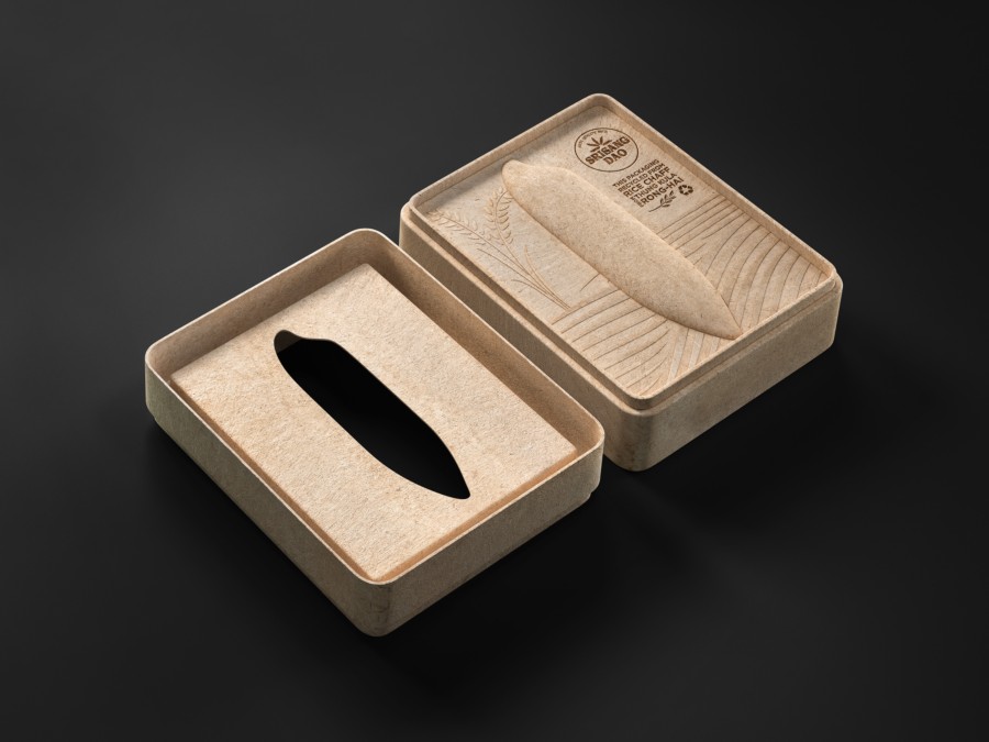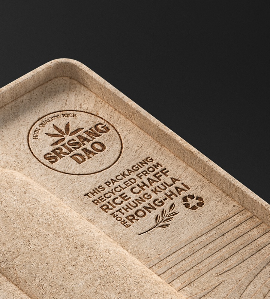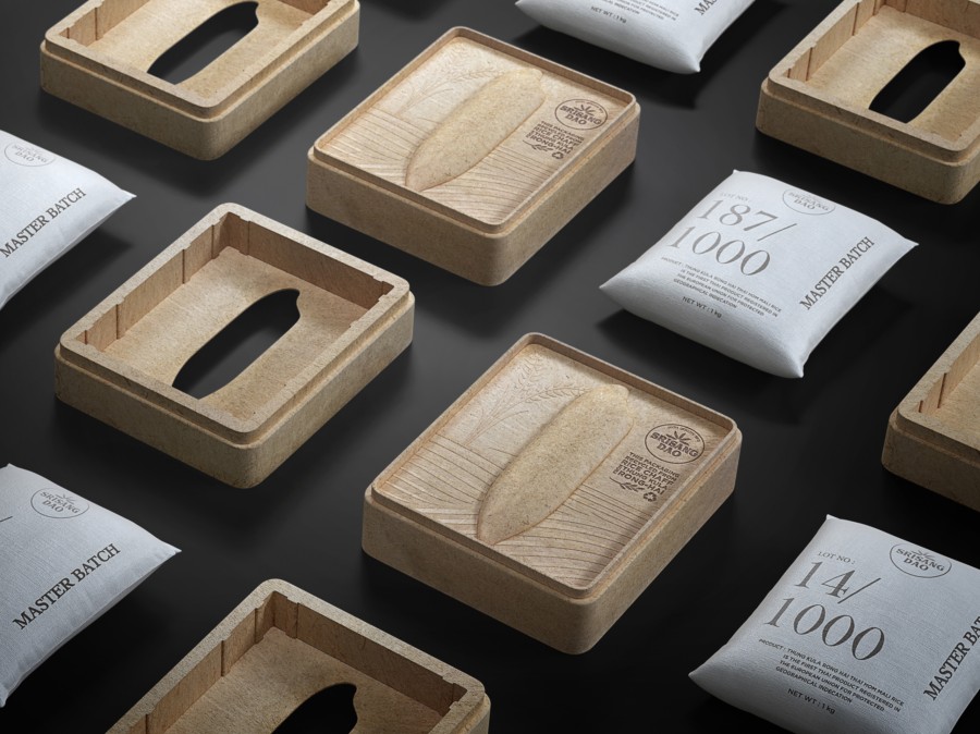 Thung Kula Ronghai是泰國著名的稻米產(chǎn)區(qū),其優(yōu)質(zhì)的稻米生產(chǎn)享譽世界。在受控的環(huán)境中,每年的大米產(chǎn)量有限。因此,這種有機大米保證了最好的質(zhì)量和不含化學(xué)物質(zhì)。大米包裝設(shè)計面臨的挑戰(zhàn)是如何體現(xiàn)有機水稻的生長過程。Prompt Design設(shè)計的包裝袋使用的是來自于稻米去殼過程的廢棄物——糠皮。包裝模壓成型,盒蓋頂部為稻形壓花,盒子里裝著米袋。此外,這個大米包裝盒使用后可以用作紙巾盒。真正體現(xiàn)了環(huán)保的初衷。